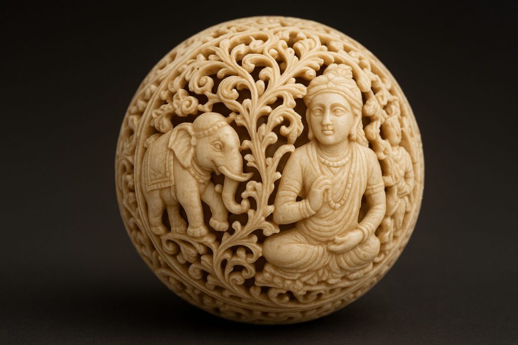 1本の象牙から数十層の球を内部に彫り出し、各層が独立して動くという驚異的な技巧で、清朝宮廷工房の象徴ともいえる存在です。