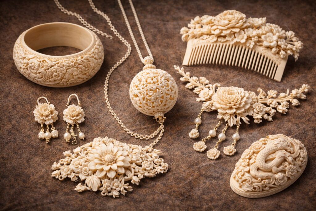 また、象牙は自然素材ならではの温かみや光沢を持ち、使い込むほどに飴色へと変化していく特徴があります。この経年変化も魅力の一つとされ、単なる装身具ではなく「長く愛用する装飾品」として大切に扱われてきました。職人の技術力が反映されやすい素材であることから、象牙細工の装飾品は実用品でありながら、同時に美術工芸品としての価値も認められてきたのです。