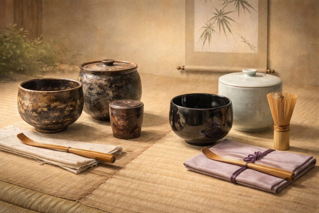 • 茶道具同士がぶつからないように、個別に布で包むか、箱に入れて保管します