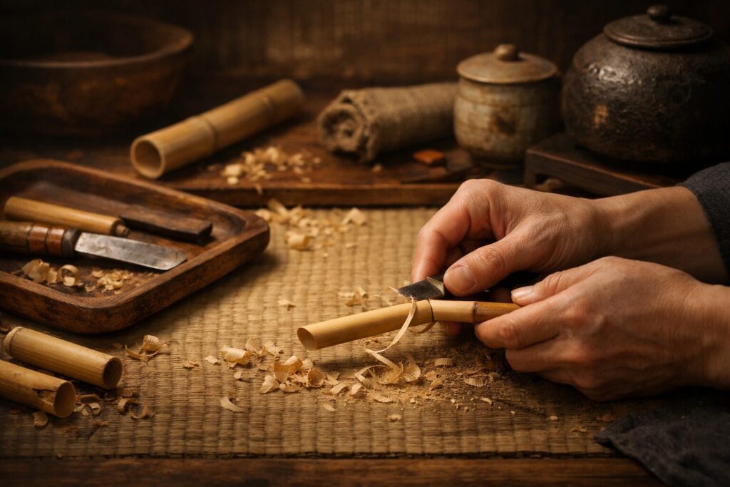 茶杓の削り出し技法は、竹という自然素材を活かしながら、熟練の職人によって一本一本手作業で作られる伝統的な技術です。この技法は、茶杓をただの道具としてではなく、茶道の美意識や日本文化の精神を反映した特別な存在に昇華させています。本節では、削り出し技法の特徴やその歴史、文化的意義を詳しく解説し、茶杓が持つ深い魅力に迫ります