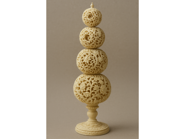 中国では、清朝期(17〜20世紀初頭)に象牙彫刻が最も栄えました。特に有名なのが、細密な透かし彫りで作られた「多層球(コンセントリックボール)」や、官僚・神仙を題材にした立像です。
